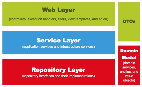 객체가 포함되는 영역컨트롤러가 포함된 웹 레이어 계층과 데이터 접근을 수행하는 리포지토리 계층을 중재